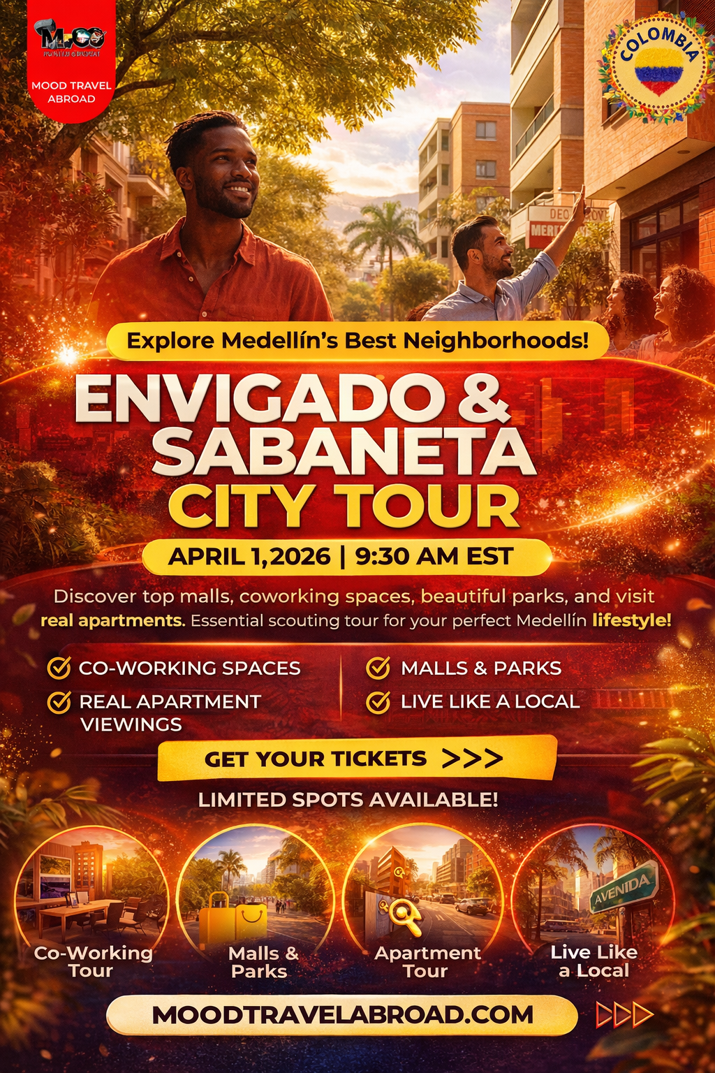 Dates:Wednesday, April 1– Sabaneta/Envigado, April 2 – Laureles, April 3 – Poblado
